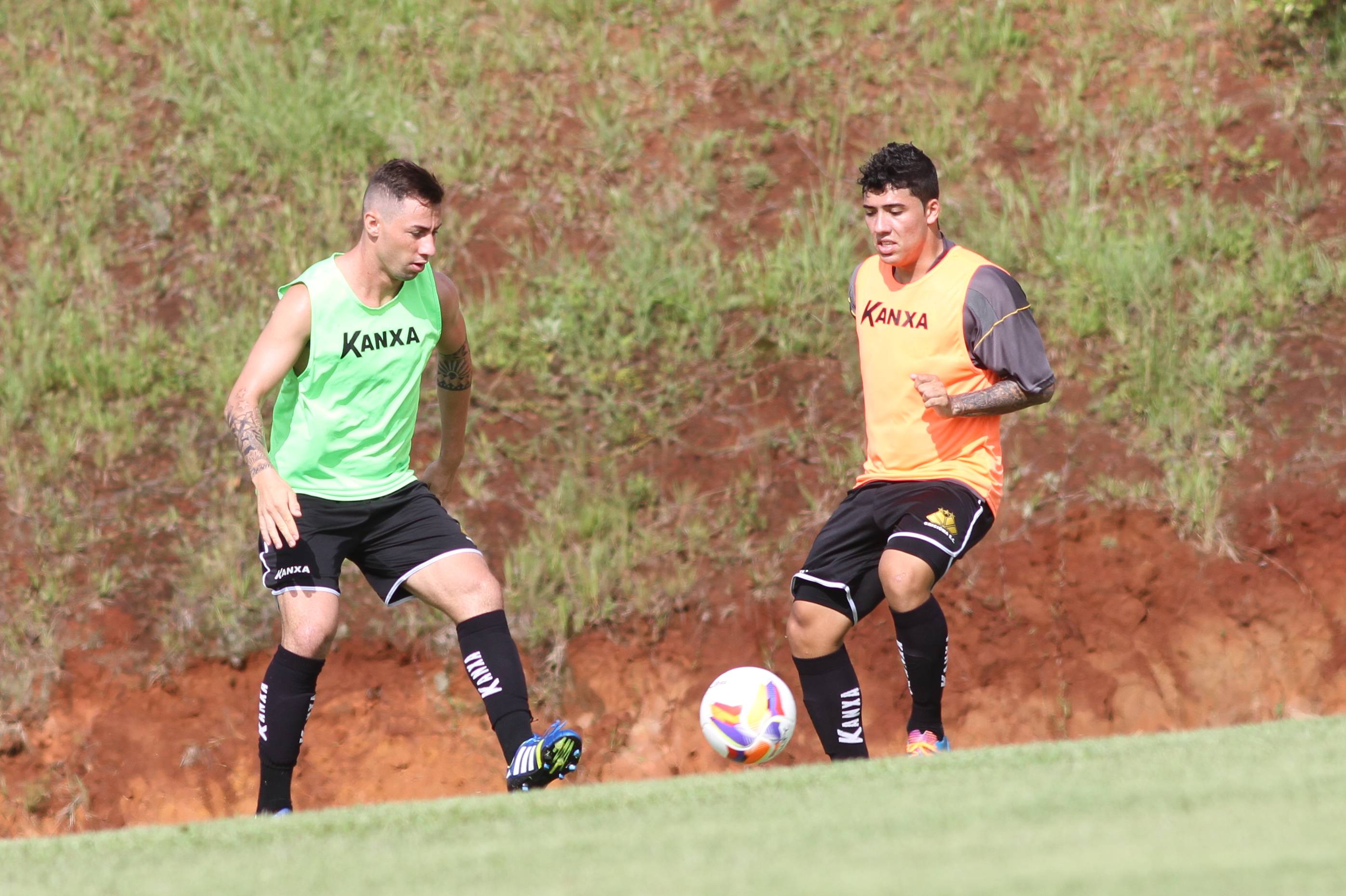 Legenda: Luizinho Mello e Bruno Lopes durante treino do Criciúma na manhã desta sexta-feira (16/01) no Centro de Treinamento, no bairro Cristo Redentor