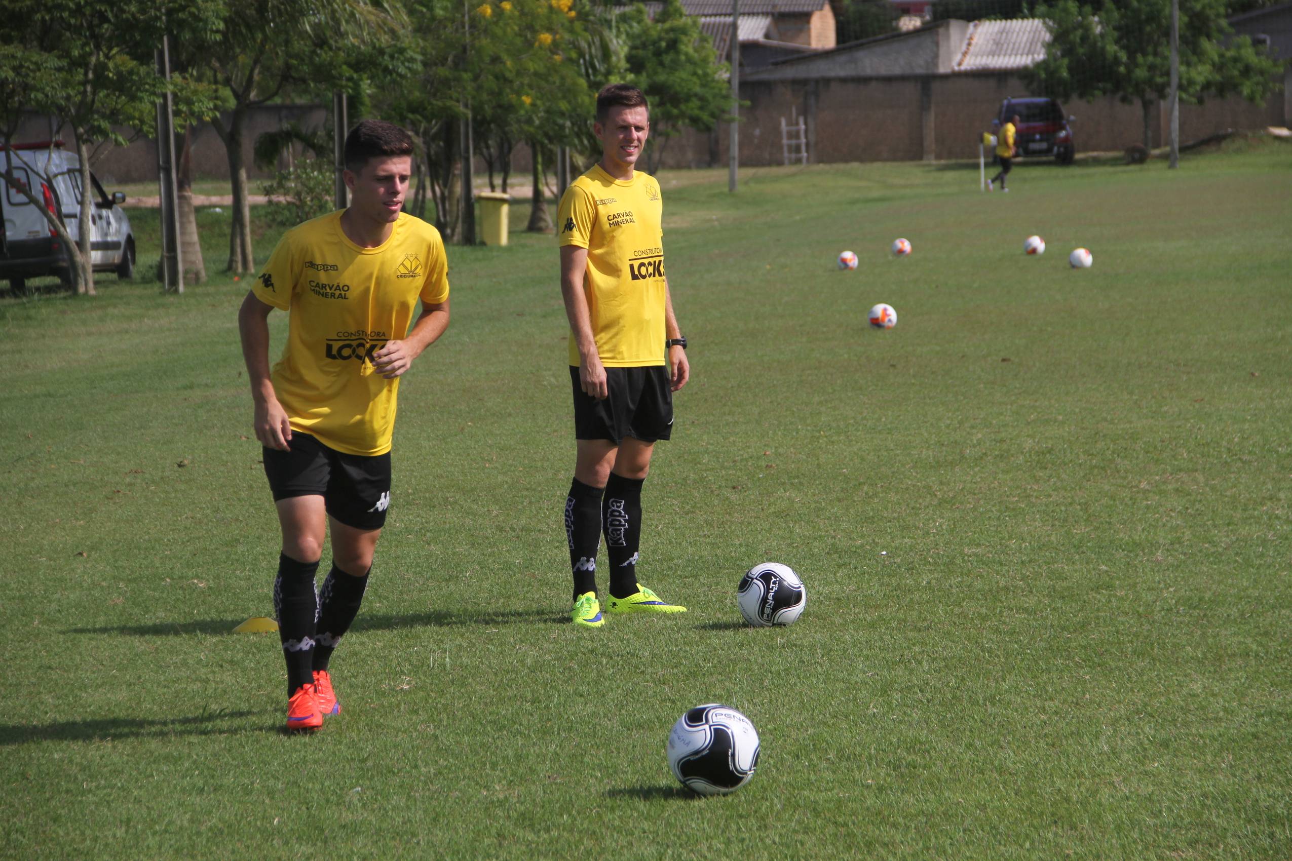 Legenda: Eduardo e Ezequiel durante treino do Criciúma na tarde desta segunda-feira (08/02), no Centro de Treinamento, no bairro Cristo Redentor