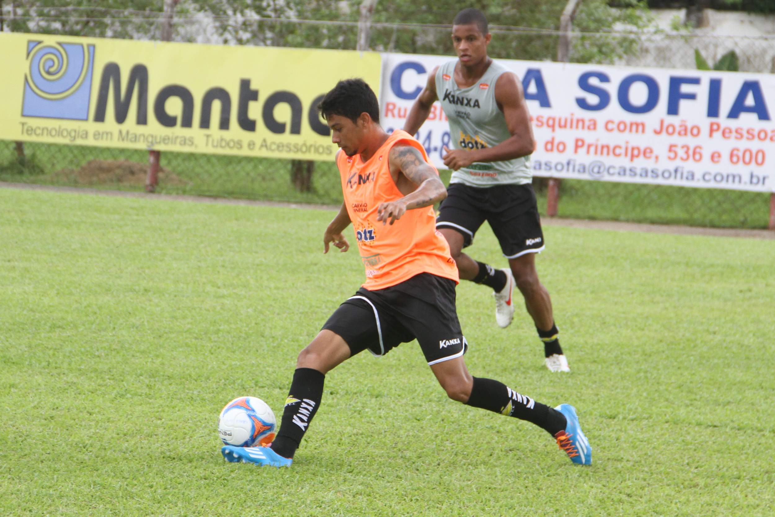 Legenda: Lateral direito Eduardo e meia Thiago Humberto durante treino do Criciúma no estádio do América, em Joinville, na manhã deste sábado (25/01)
