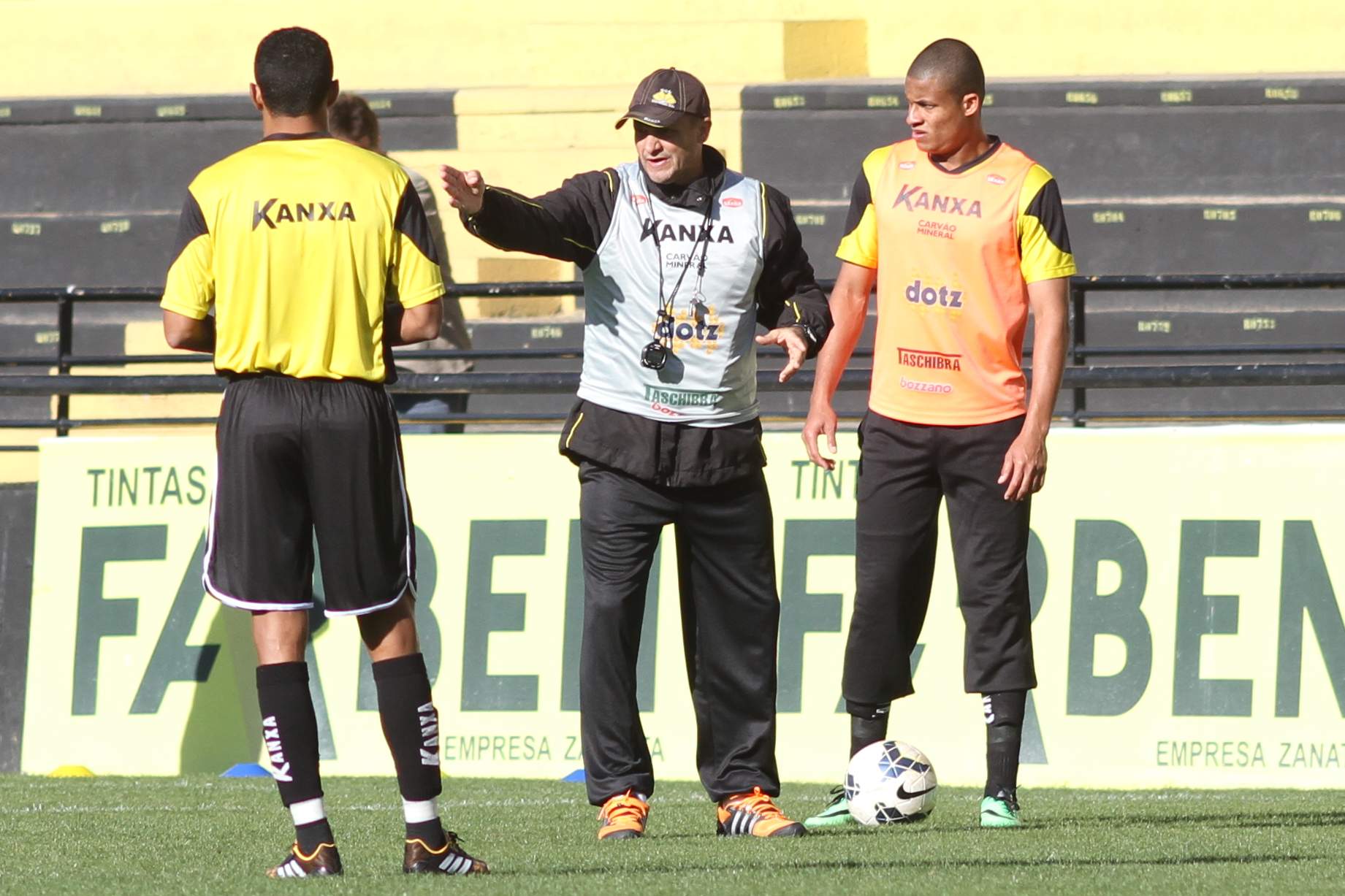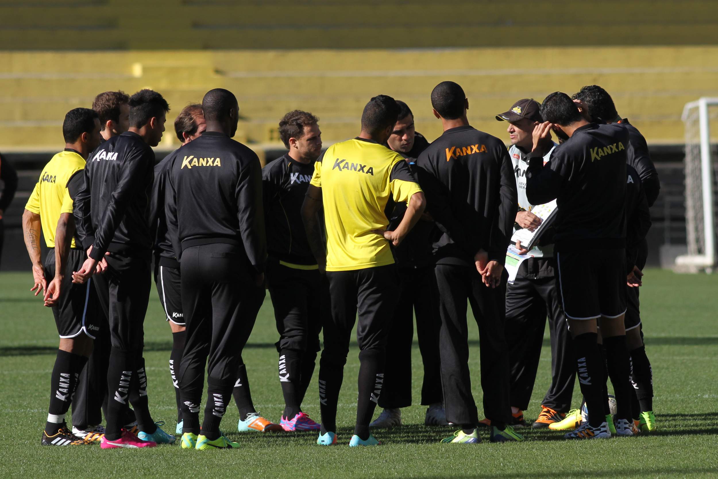 Legenda: Técnico Wagner Lopes conversa com os atletas durante treino no estádio Heriberto Hülse na tarde desta quinta-feira (14/08)